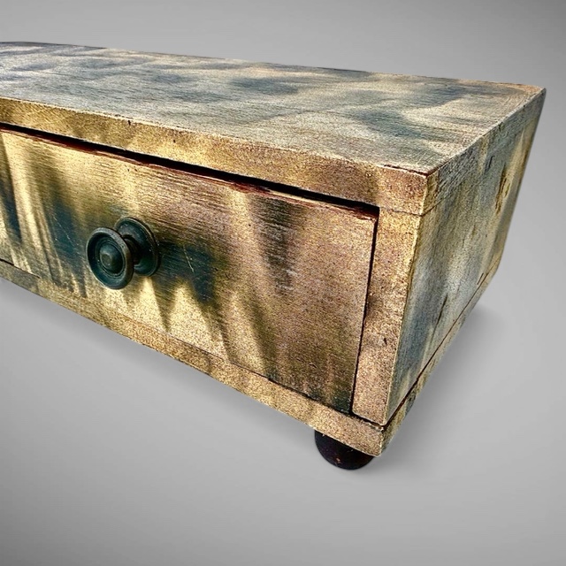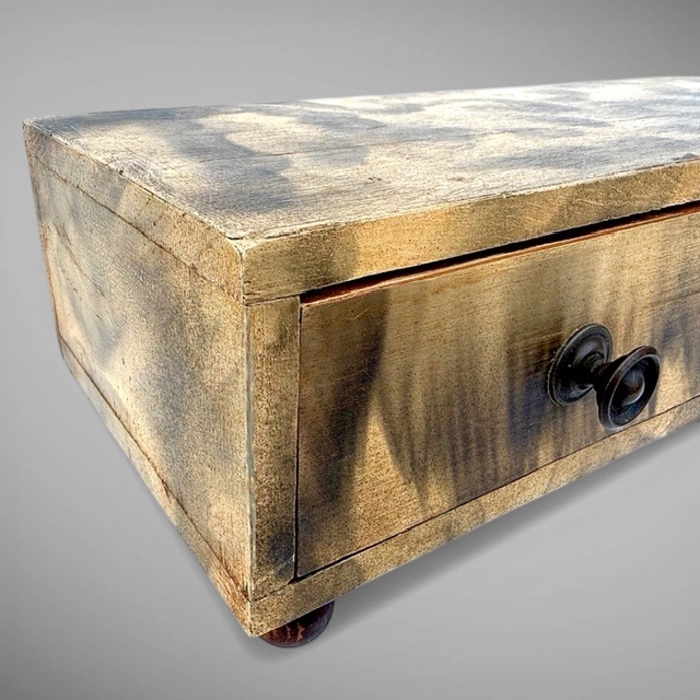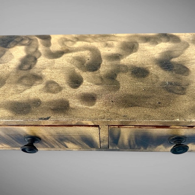 Smoke-Decorated Box— This 19th-century box features well-done smoke decoration on a creamy yellow background. The two drawers, which are dovetailed, have their original brass knobs. And round wooden feet provide a visually appealing "lift". The dimensions are 17" wide, 7" deep, and 5" high. Superb condition.