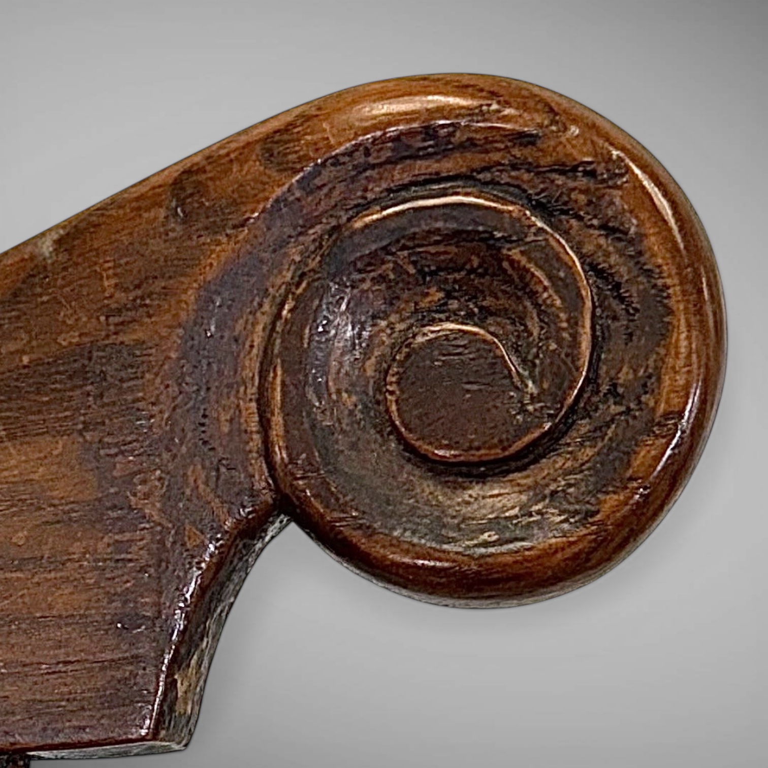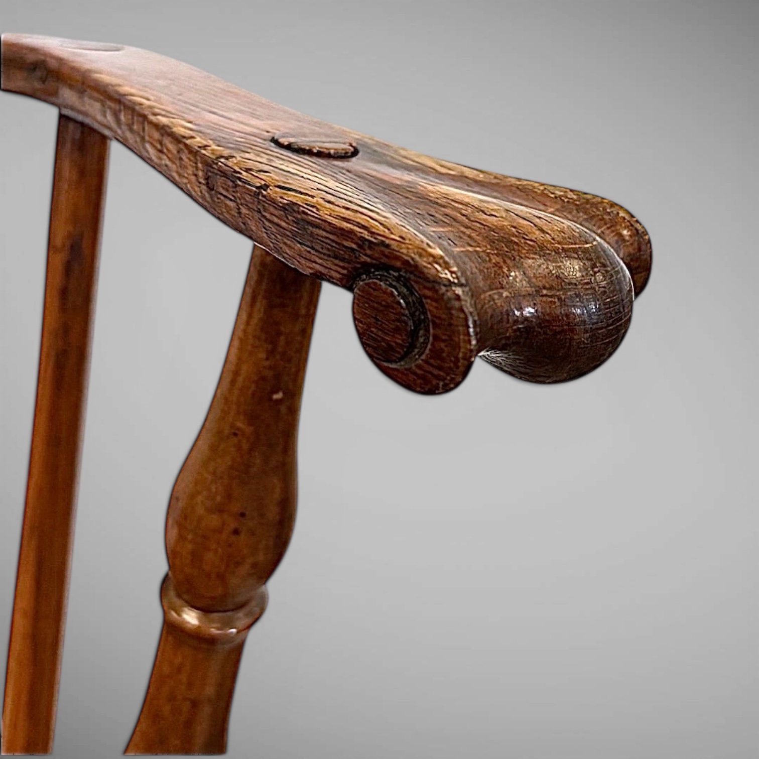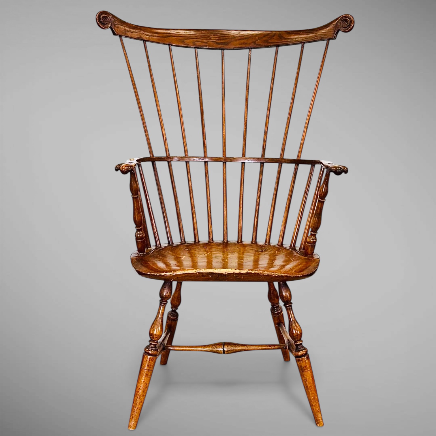 Comb-Back Windsor — This late 18th century armchair features carved "ears" on a graceful crest rail that is 42" tall. The chair's arms have carved, one-piece "knuckles". And its nicely shaped seat is 18" high. This comfortable chair was originally painted black, and now its surface has a mellow, honey color.