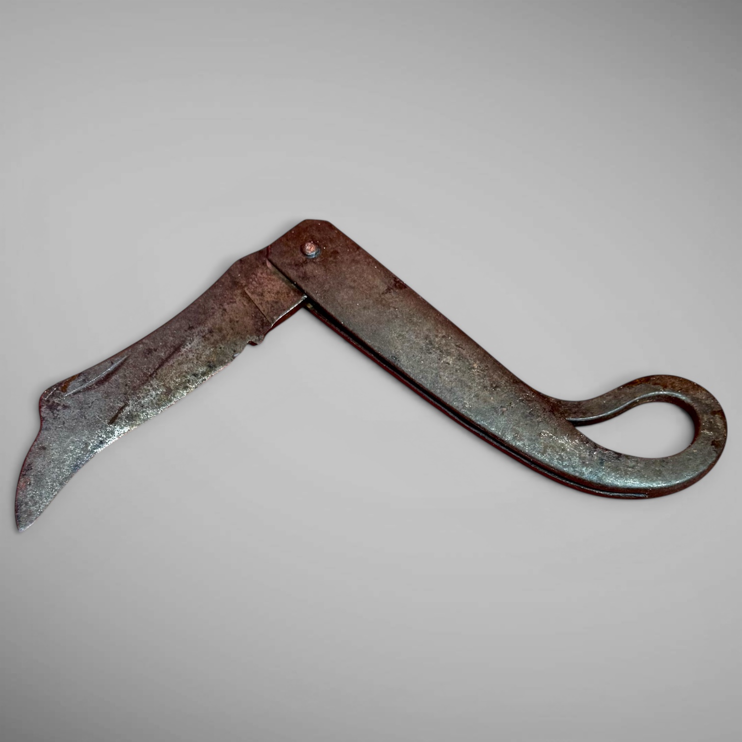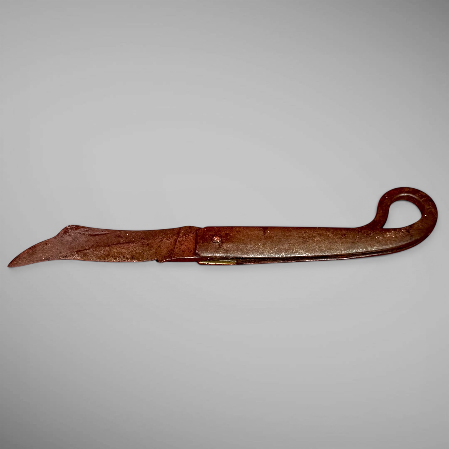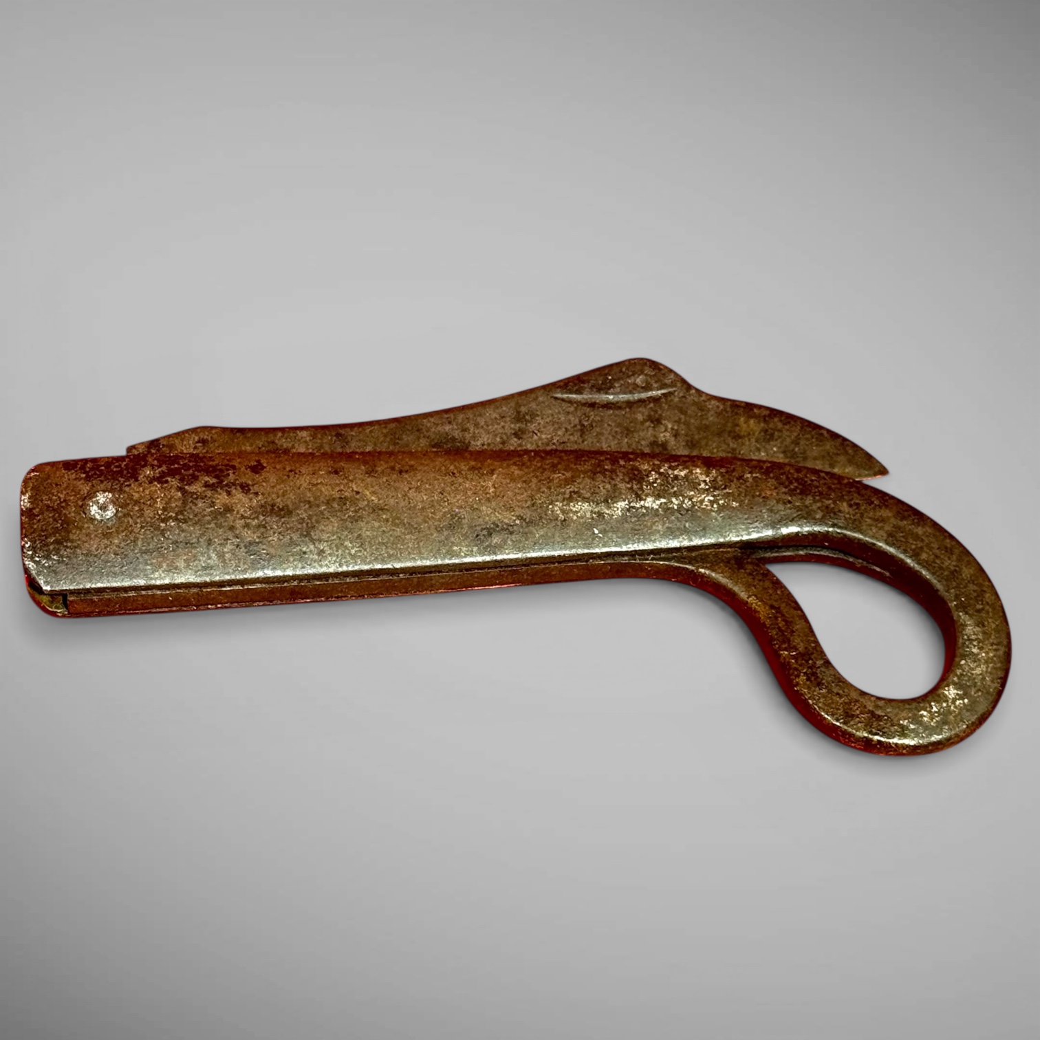 26-010. A rare and early jackknife featuring an eagle-shaped blade and an integral flint striker. The knife is constructed with a one-piece forged steel case fitted with a steel blade. A finger ring at the end of the handle serves as a flint striker for fire-starting, combining two essential functions in a single, compact tool. The surface remains wonderfully untouched, retaining its original character and patina. The knife measures approximately 7 inches closed and 12.5 inches open, with a 5.25-inch blade. A scarce and difficult form to find—particularly in such an early example with high-quality workmanship. This knife and striker combination is likely of Pennsylvania German origin and dates to circa 1680–1740. An unusual survivor dating from ca.1680-1740. [Provenance: A collection of 17th & early-18th century primitives from upstate New York.]