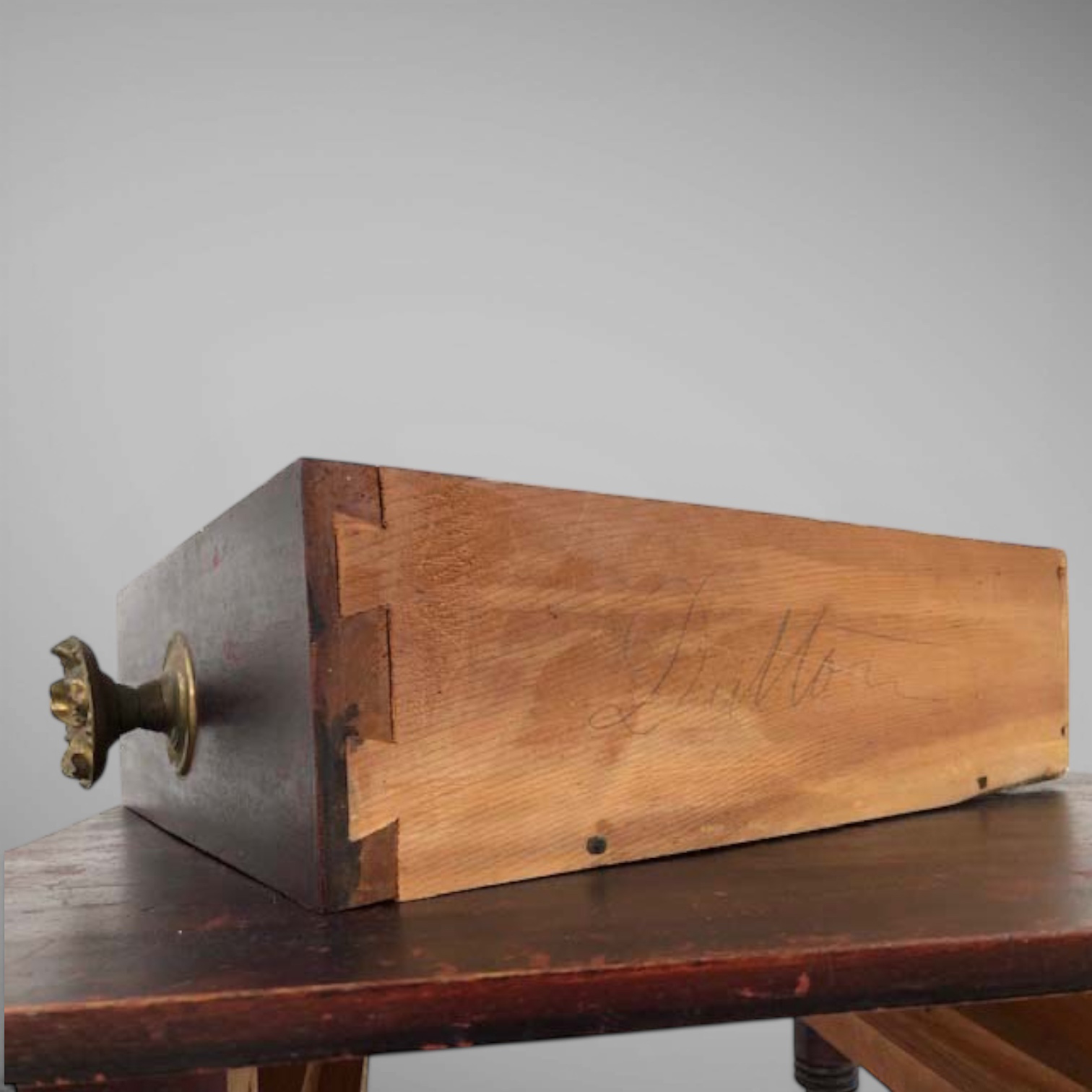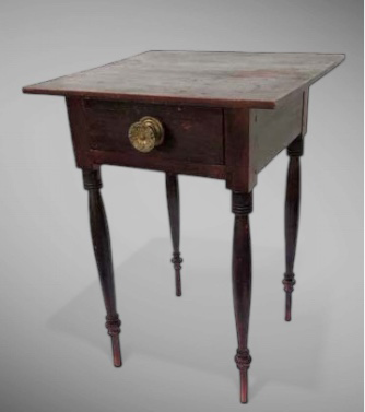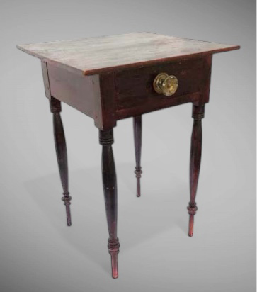 This wonderful single-drawer stand was hand-crafted by a fine country furniture maker. It is painted in a red wash that has oxidized over time. The one-board, hand-planed top is over a dovetailed and square-nailed drawer with original pull, ending in beautifully turned, delicate legs. The skirt and posts are pegged construction. The table is signed in three places by its maker, "Dutton". There is wear to the paint surface due to age and use. Ca. 1825. Measuring 28 1/2" tall with the top measuring 21" by 20". A fine little Maine country table!