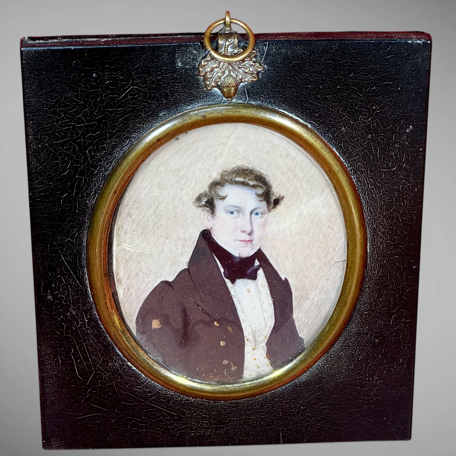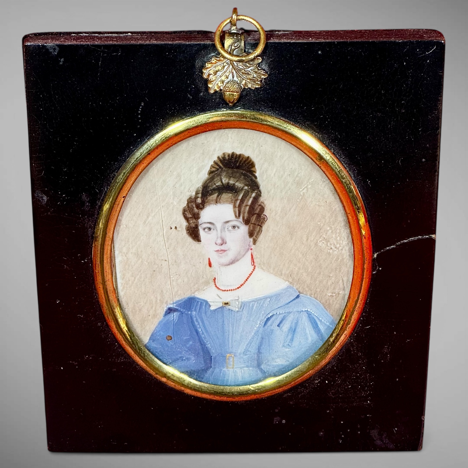 25-146. American 19th Century. Gouache on wafers of natural material. Depicting a husband and wife. Her attire consists of her hair up in a comb with cascading ringlets, red coral drop earrings, a red coral necklace, and a blue dress with puffy sleeves, lace, and a gold buckle. His attire consists of his curly hair, with a high-collared shirt, a black tie, a printed vest, and a brown jacket with gold buttons. Each in matching black lacquered frames measuring 5.5"h. 4.75"w. Both are in very good condition and date from the early to mid-19th century. Provenance: from the Lifetime Collection of Janet & Charles Muto, Ottawa Hills, Ohio.