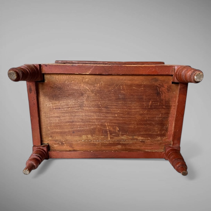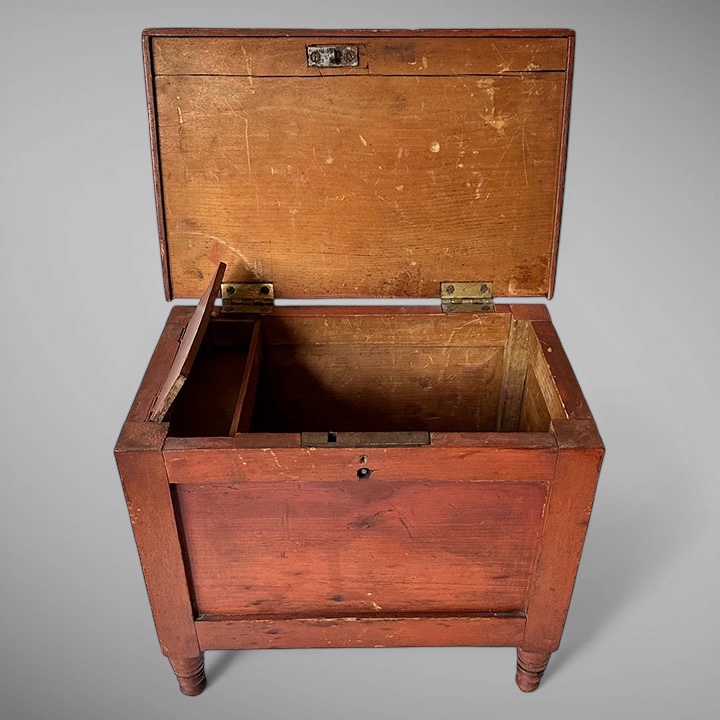 This late Federal miniature blanket chest retains its original red painted surface, interior till, hinges, and lock mechanism. The lid has an applied edge molding. The case stands on nicely turned, mortised legs. Early 19th C. Made entirely of pine. New England origin. Measuring 10" tall by 11 3/4" wide by 7 1/4" deep. There is one stable age crack in the lid. Otherwise, it is in excellent original condition.