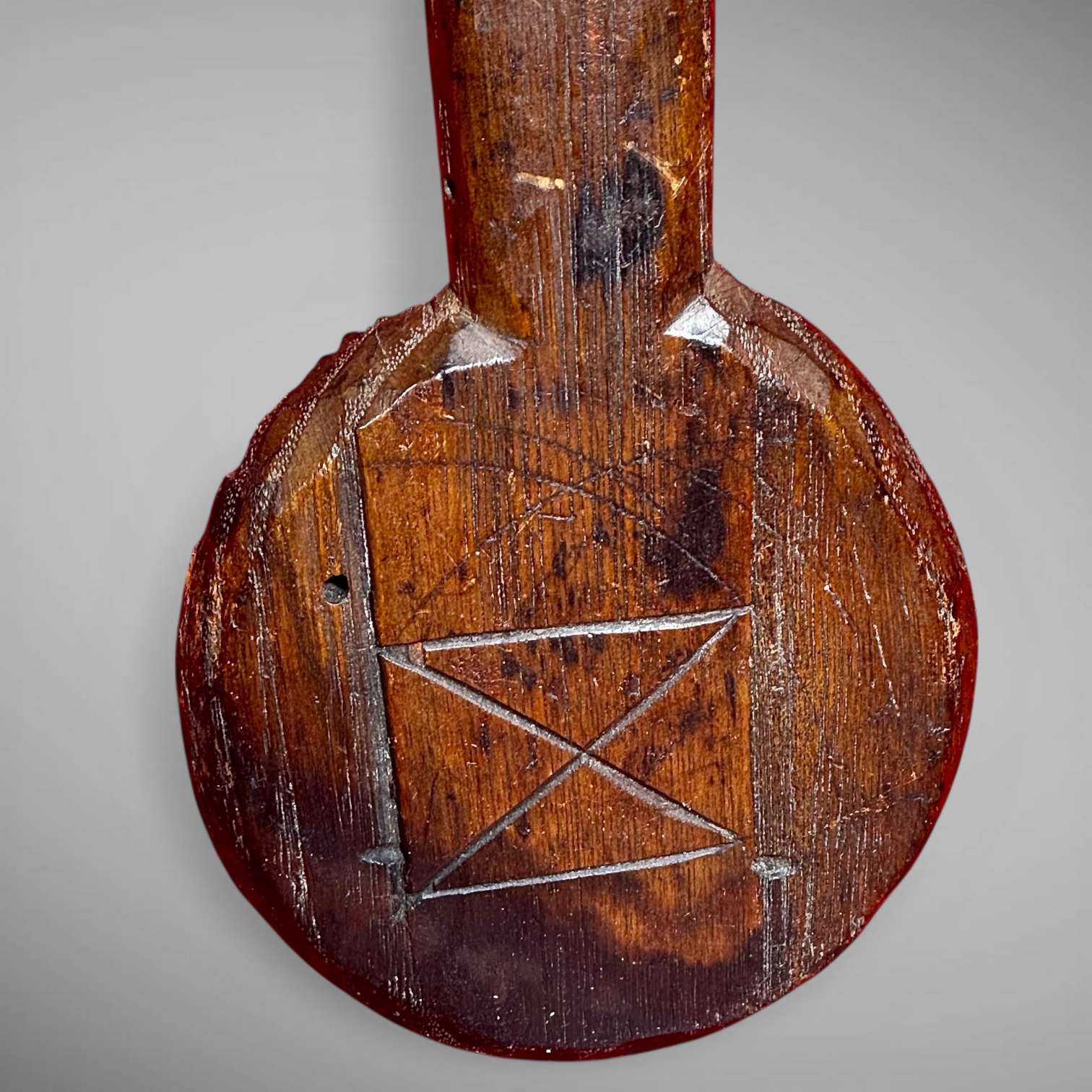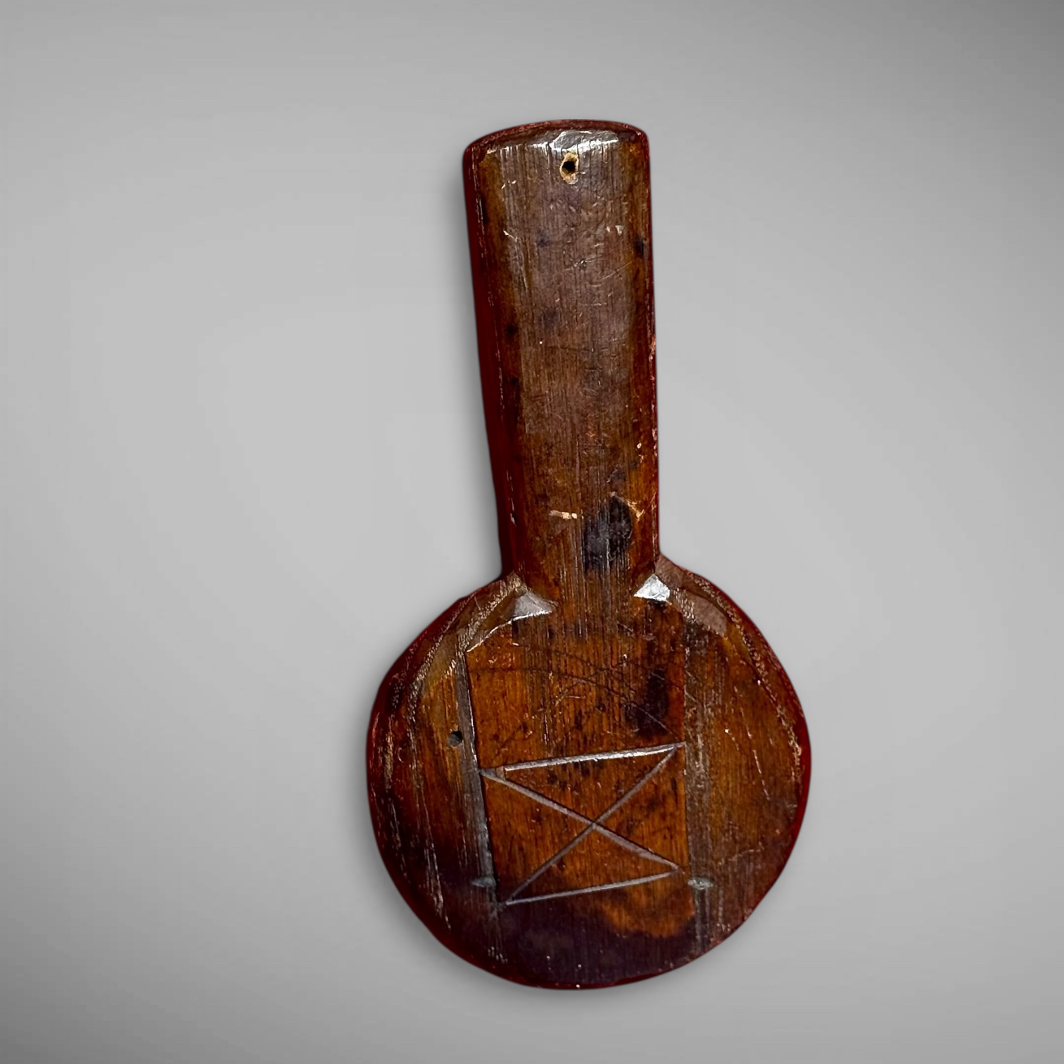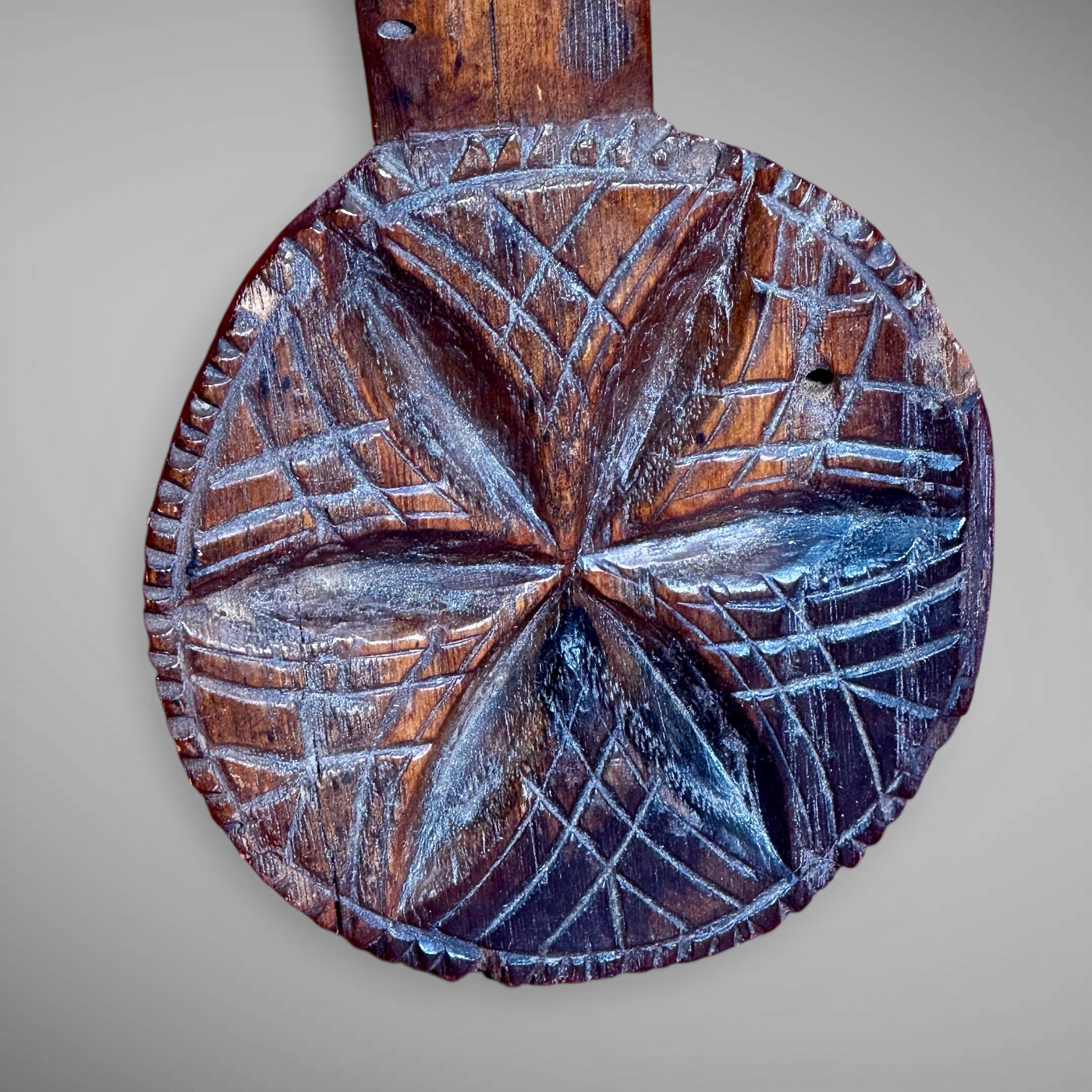 Very early lollipop butter print, with compass star pattern and a wide tapered slat-type handle. Deeply carved six-point star design with a compass layout and radiant line carved accents. Edge with non-uniform chip carved pattern. The back of the print has a carved “X”. Two small holes were made, one through handle and one in face of print. From PA and dating from the mid-18 th century.