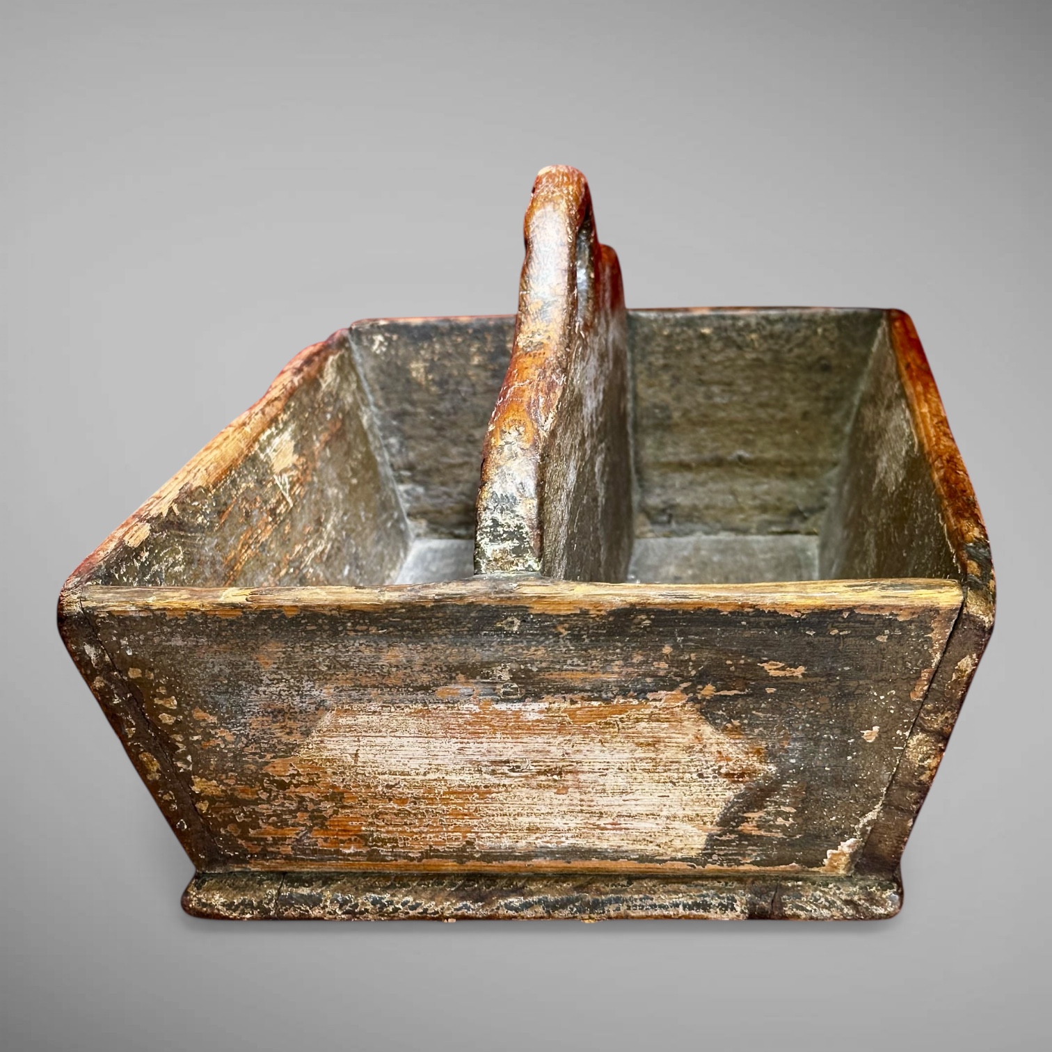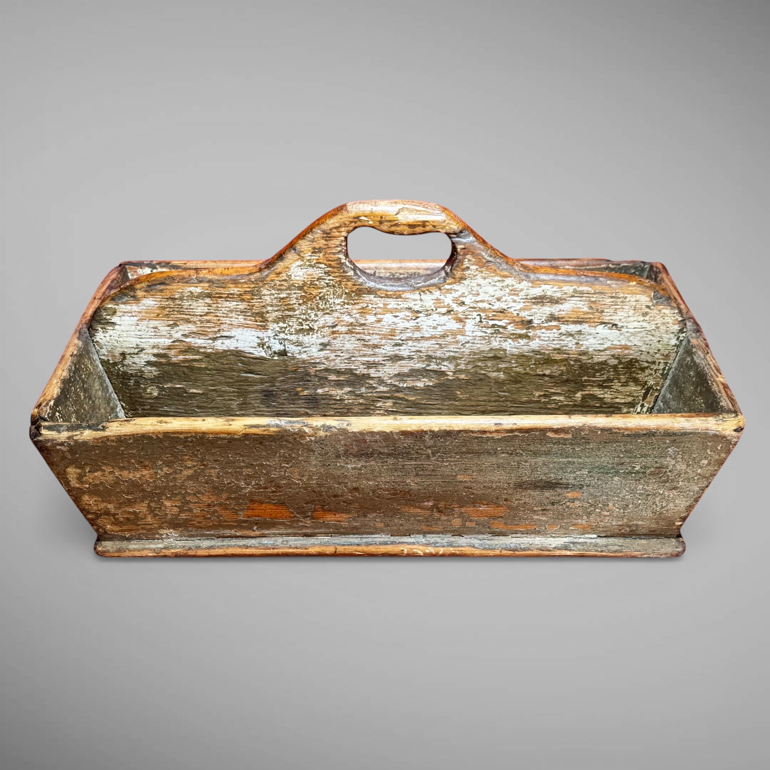 22-047. A superb, all original, paint decorated Pennsylvania cutlery box. Made of a hard wood with canted sides, two compartments, a center divider with cut-out hand grip, and square head nail construction. In its original blue/gray paint with cream-colored geometric designs and accents. In good, all original condition with wear to painted surfaces consistent with its age and use. The box measures approximately 14.75” long x 7.5” high. x 9.25” wide. Found in Western Pennsylvania and dating from the mid-19th century, an honest, unaltered primitive country piece.