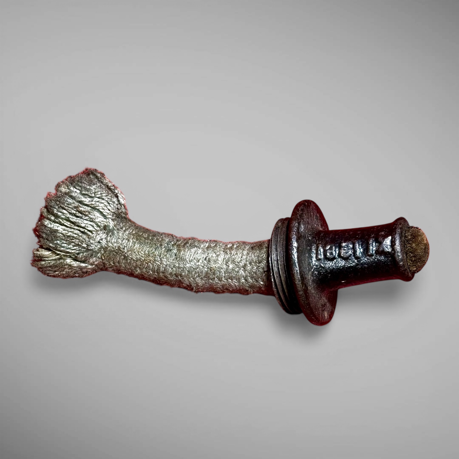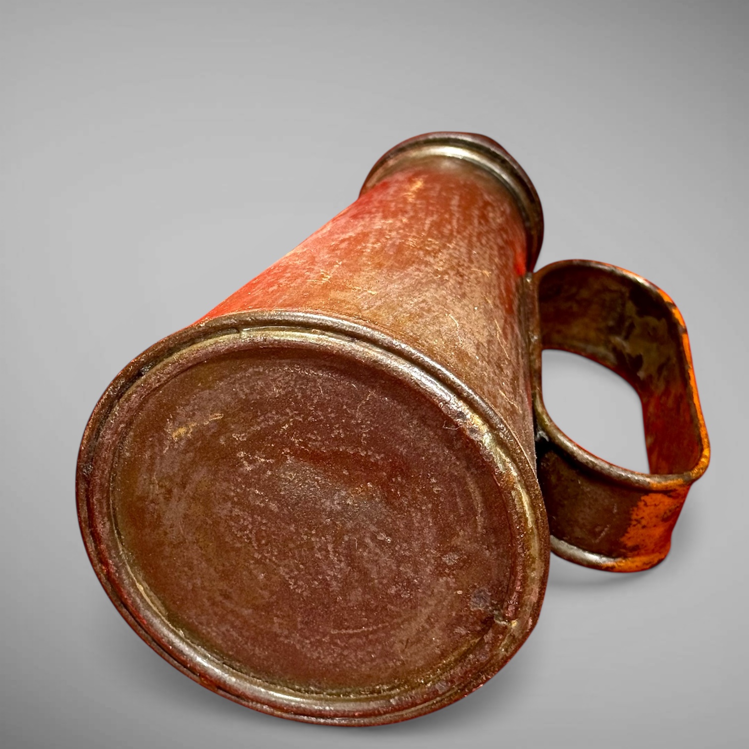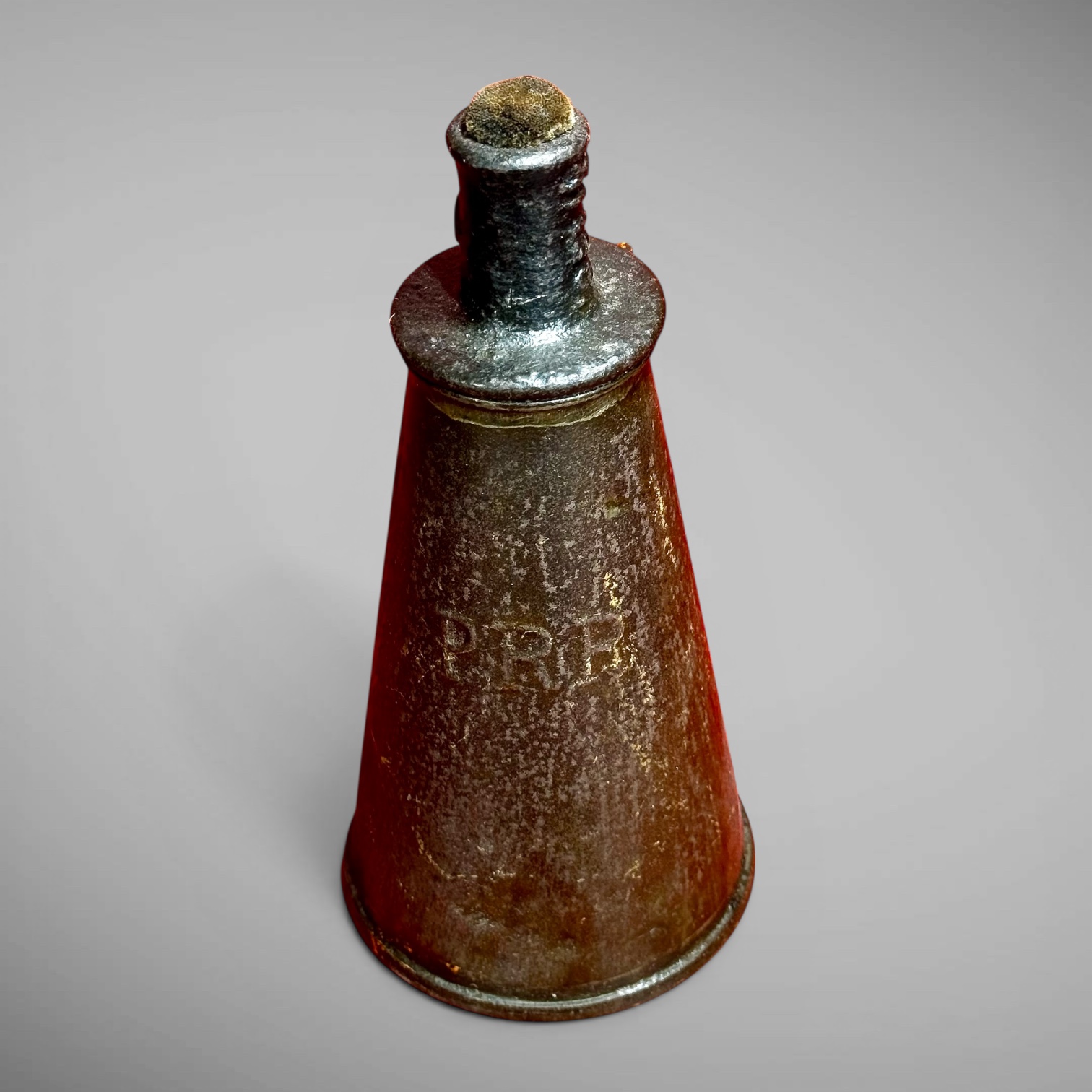 24-254. A cast iron Pennsylvania Railroad fluid torch. A single cast iron burner with a large, thick, round wick. The torch has a sturdy, reinforced sheet iron handle. The front of the piece is embossed “P R R” and the burner is embossed “1851(?) IX”. Condition: except for the black burner the torch is not painted. It is in very good condition, with no damage or repairs. It is sturdy and very stable. The torch is from PA and dates from the mid-19th century.
