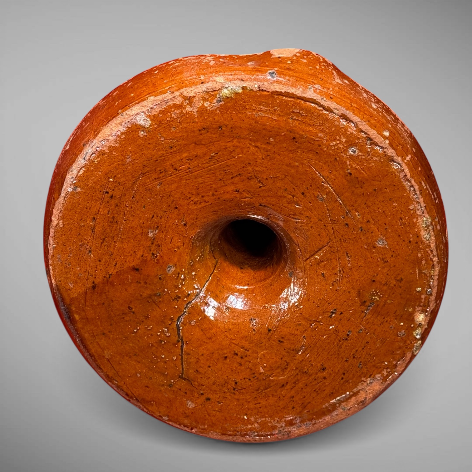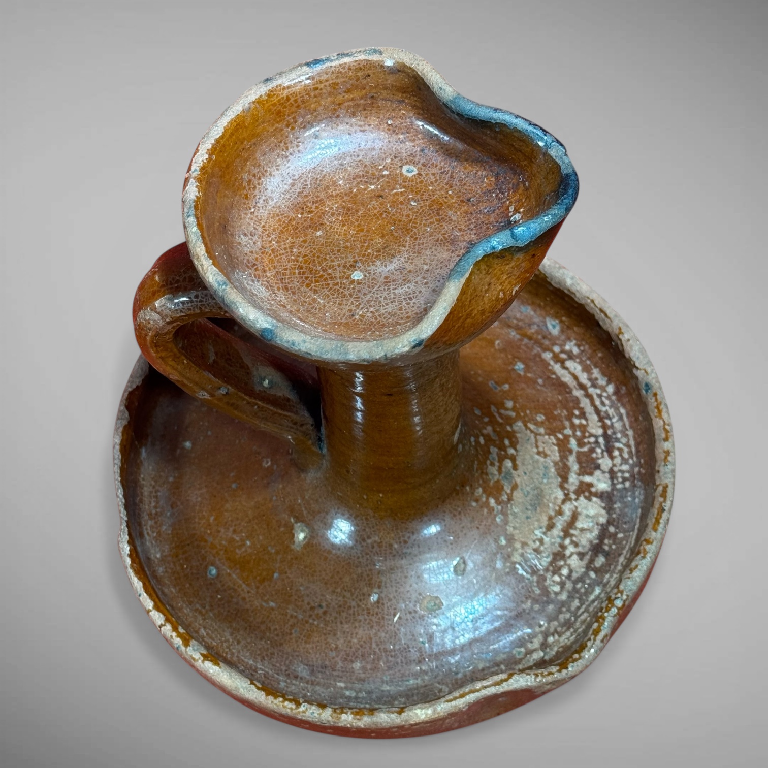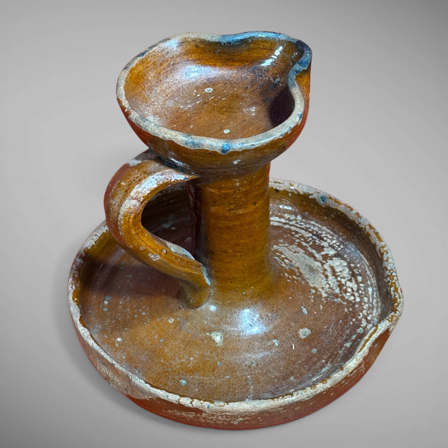 24-277. This is a scarce Pennsylvania Redware fat lamp, measuring approximately 6.5” high. Early Redware lighting like this is hard to find. This example is in as good-as-found condition, as it shows wear from everyday use. There are glaze loses and a well repaired crack in the base. It is all very stable and a good example of an everyday, domestically used early lighting device. It is from Pennsylvania and dates from the late-18th to early 19th century.