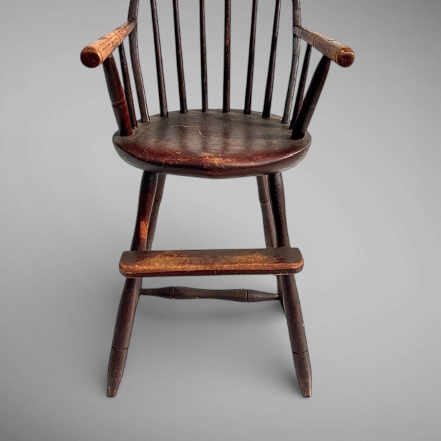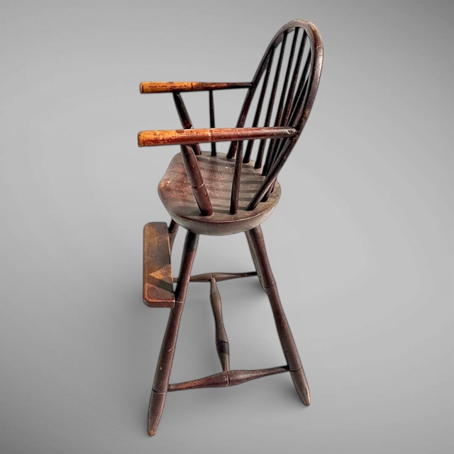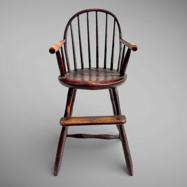 Red Windsor High Chair — This all-original, bow-back, Windsor chair was made more than 200 years ago. Yet, it is in flawless condition, with a dark red, ideal surface. The overall height is 34", and the front legs are 16" apart. The chair's excellent splay adds to its stability as well as its beautiful stance. The front of the seat has a slight pommel too.