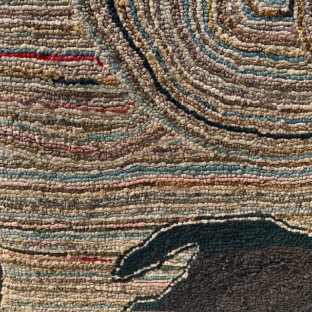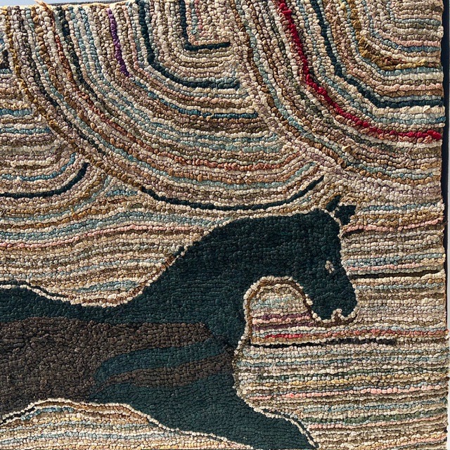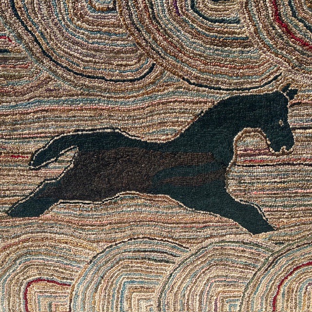 Running Horse Rug — This late 19th-century hooked rug presents the folky design of a running, two-color horse. Its simple figure is surrounded by the rug hooking effort of its skillful maker. The colorful background includes multiple, overlapping portions of what appear to be round, braided table mats. Professionally mounted for wall display, this unique rug is 38" wide and 36" tall. $1,250.
