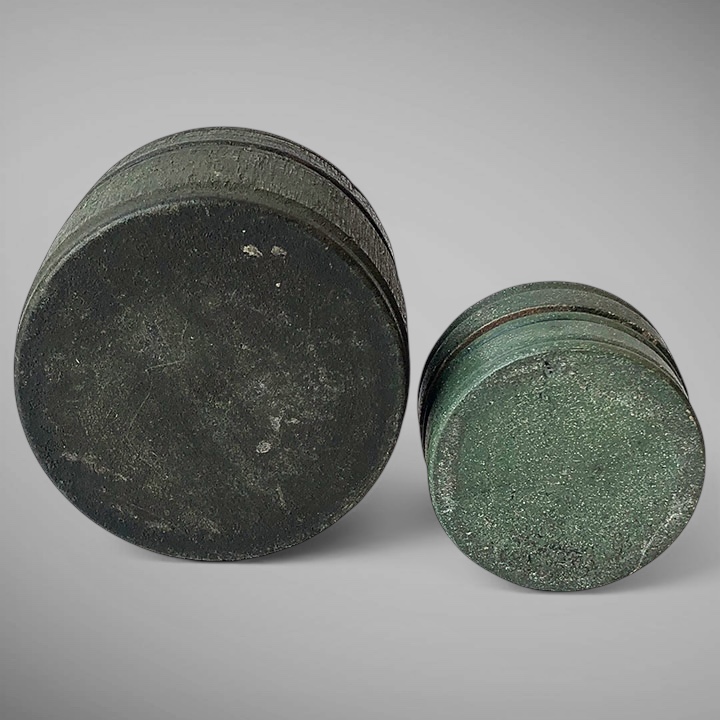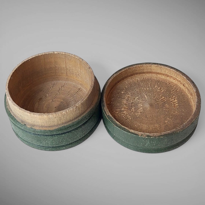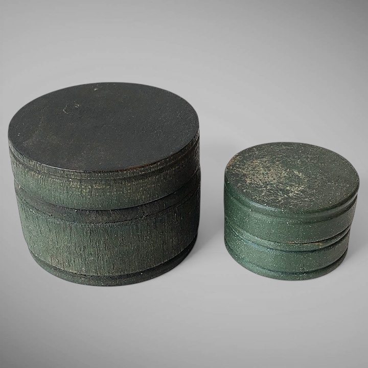 These two tiny Shaker pill boxes are finely turned with incised rings on the top, middle, and bottom edges. Each is turned from a single piece of wood. Both retain their original green painted surface. 19th C. Measuring 2" and 2.5" in diameter. A "hard to find" item.