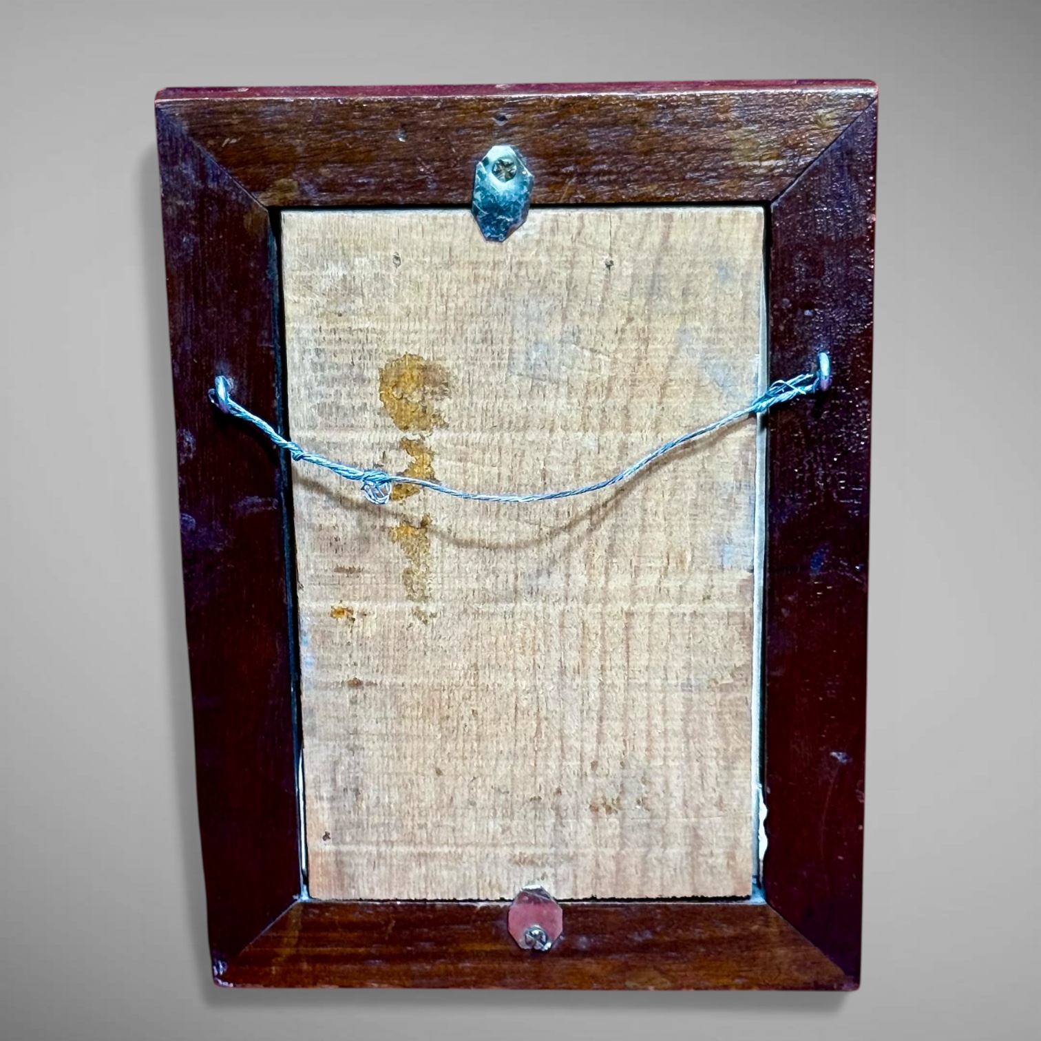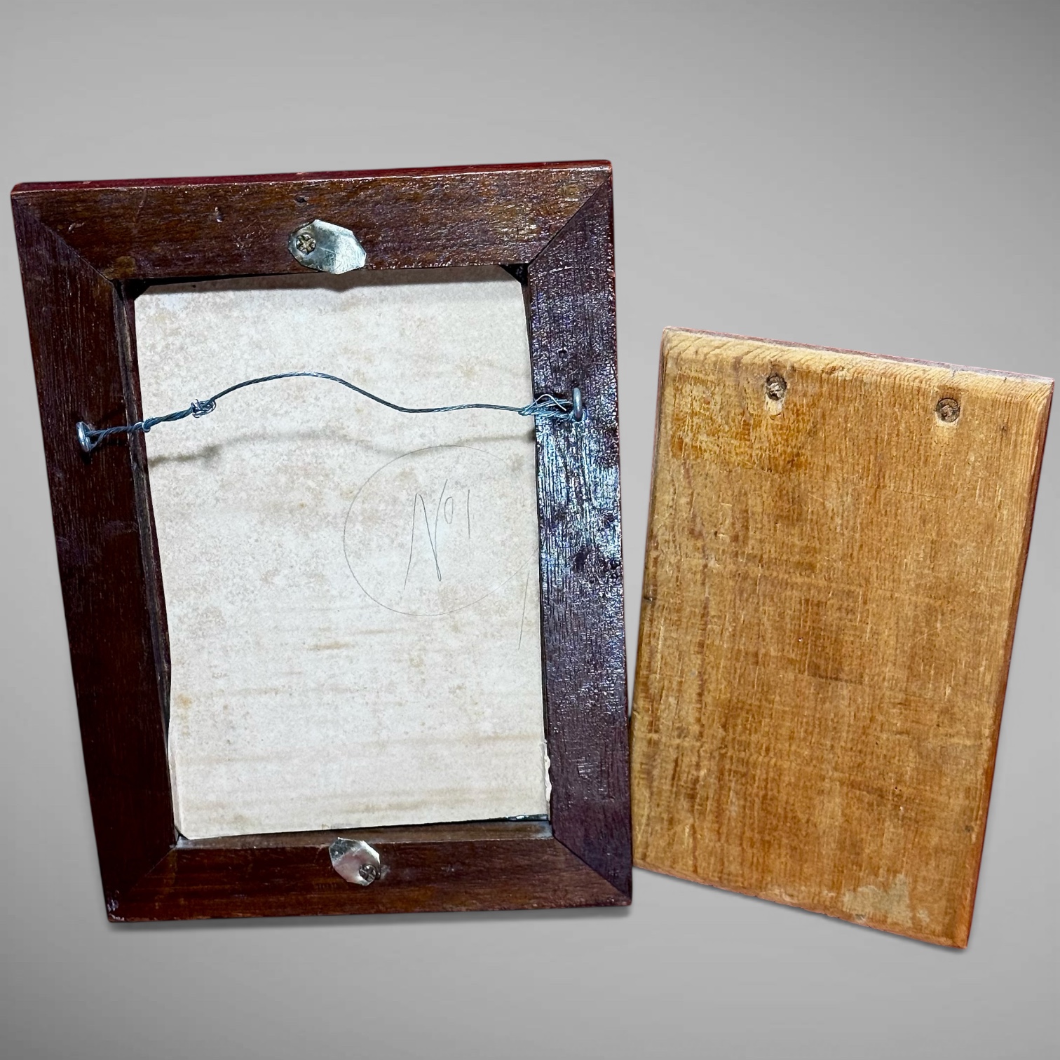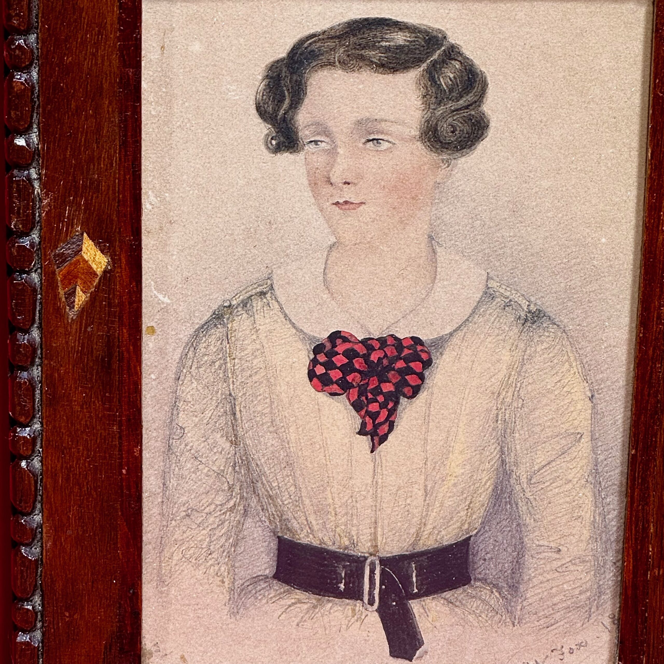 22-137. Pencil and watercolor of a young woman in a blue tinted dress with a black belt and checkered tie about her neck. It is marked “F.W. Fox 182?”. Mounted in a later walnut and parquetry decorated frame measuring 8” x 5.75”, sight size 6” x 3 75”.