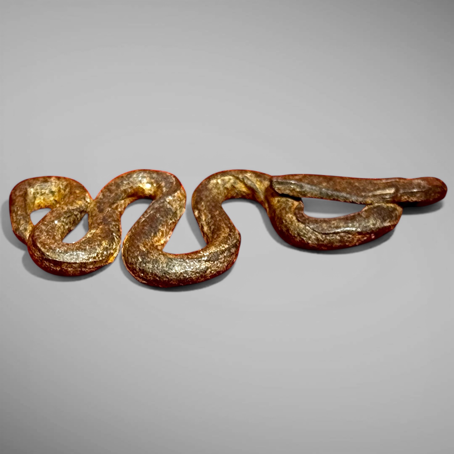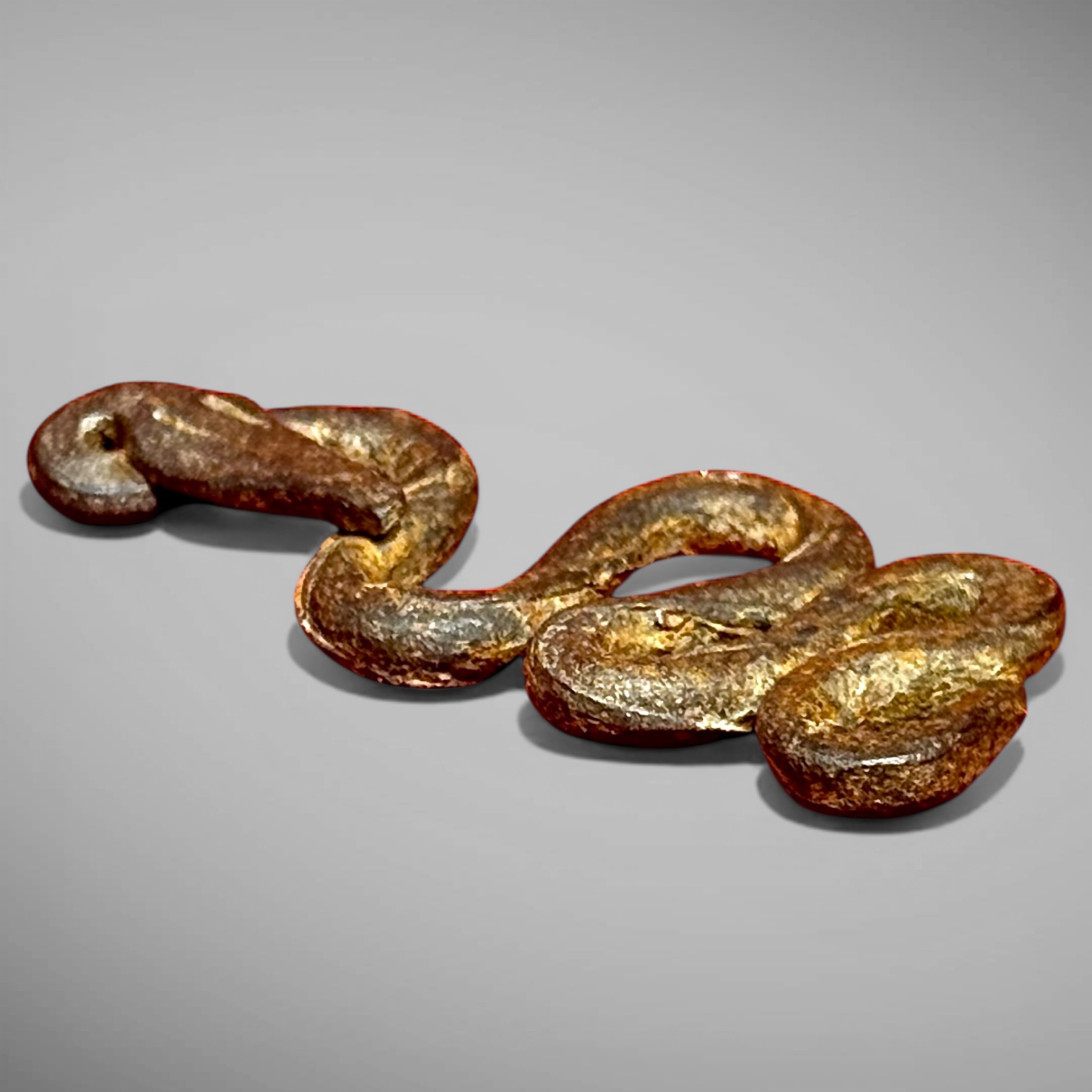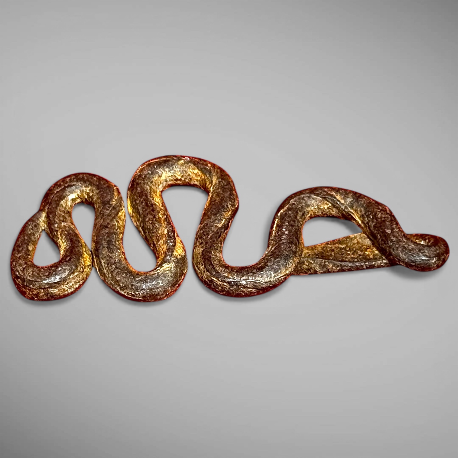 25-191. A hand-wrought iron snake in an undulating, serpentine pose. Designed as a whimsical flint striker. It measures approximately 2.25” in diameter. Well modeled and tool decorated by a skilled blacksmith. It was found in New England and likely made in that region. The piece dates from the late-18th into early-19th century, ca. 1790-1820.