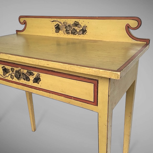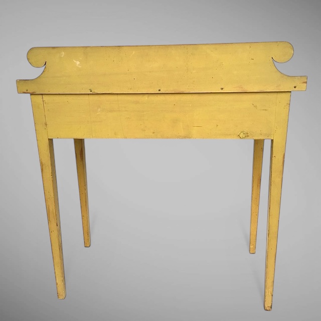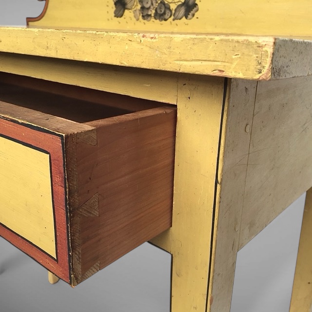 Decorated Yellow Server — This 19th-century serving table combines a beautiful design with an equally beautiful, painted surface. The shaped backboard contrasts nicely with the straight lines of the tapered legs. The full-width drawer is dovetailed, too. 35" wide, 17 1/2" deep, 37" tall, with a serving height of 32 1/2". Excellent condition.